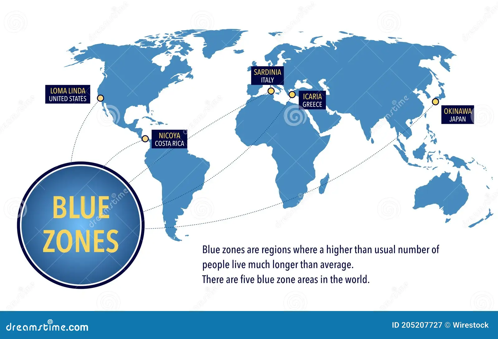 За да получи една територия името „синя зона“, концентрацията на столетници там трябва да е по-висока, отколкото в страната. Струпване на столетници са търсени по-специално в град Вилкабамба (Еквадор) и на остров Крит (Гърция). Но в крайна сметка се оказва, че те не могат да бъдат наречени „сини зони“. Но към списъка са добавени полуостров Никоя (Коста Рика) и остров Икария (Гърция).