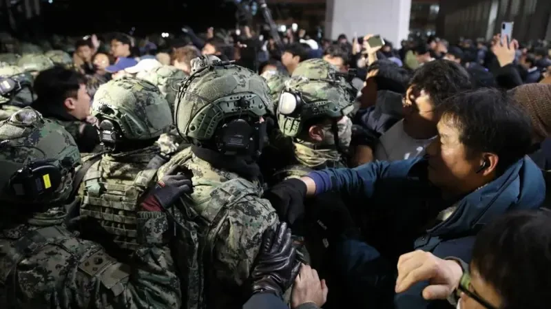Между полицаите, охраняващи входа на парламента и протестиращите, имаше и сблъсъци, които обаче не прераснаха в сериозни сблъсъци. Тълпата се опита да попречи на екип от армейски специални части да влезе в сградата. Военните наистина влязоха, но, съдейки по предаването на корейските телевизионни канали, те не са използвали прекомерна сила. След гласуването спецчастите напуснаха сградата, а тълпата на входа приветства отмяната на военното положение с възторжени викове.