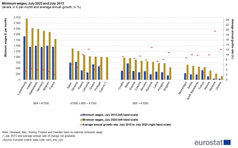Според Евростат, към юли 2025 г. минималната месечна заплата (преди удръжки) в страните от ЕС е варирала от 551 евро в България до 2704 евро в Люксембург.