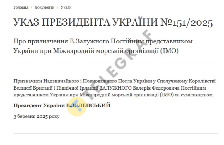Наскоро Валерий Залужни, бивш главнокомандващ на украинските въоръжени сили и сега посланик на Украйна във Великобритания, получи нова позиция. На 3 март 2025 г. украинският президент Володимир Зеленски подписа указ № 151/2025, според който Залужни е назначен за постоянен представител на Украйна в Международната морска организация (IMO).