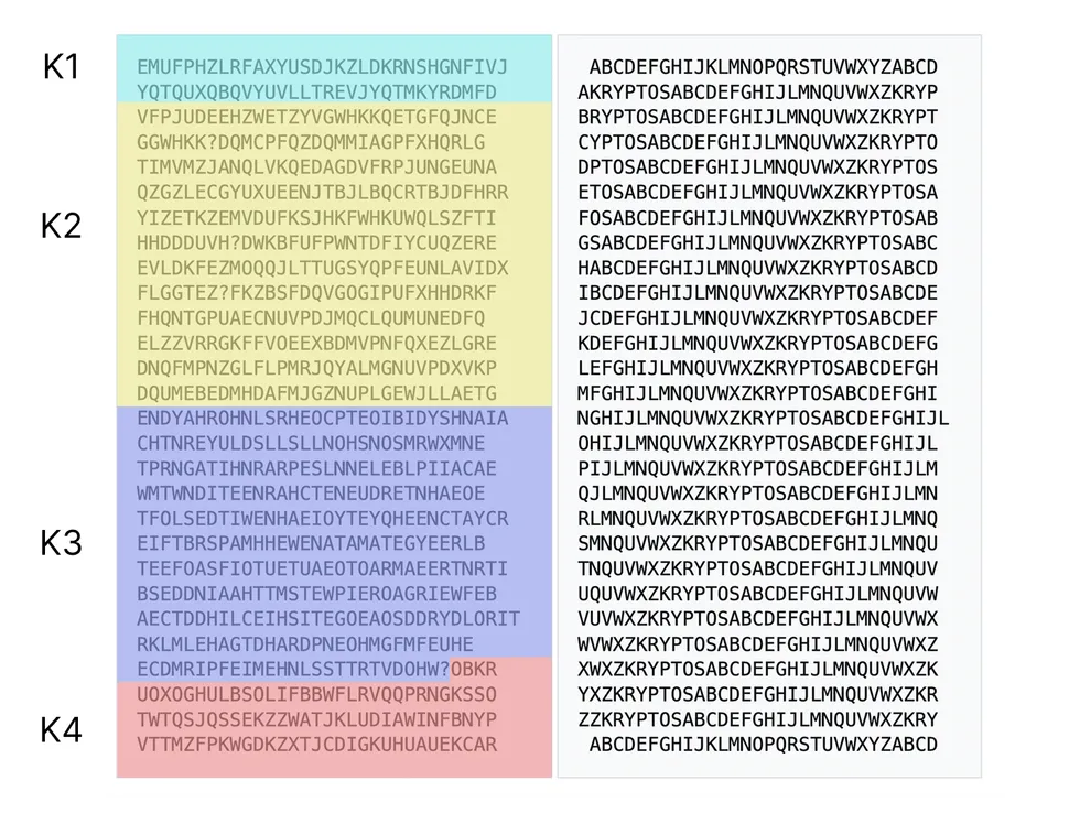 K1 и K2 са шифри на Виженер, където всяка буква се измества по азбуката, за да съответства на буквите на секретен ключ. (Ключът за K1 е „палимпсест“, а за K2 е „абсциса“.) K3 е транспозиционен шифър, където буквите остават самите, но са пренаредени.