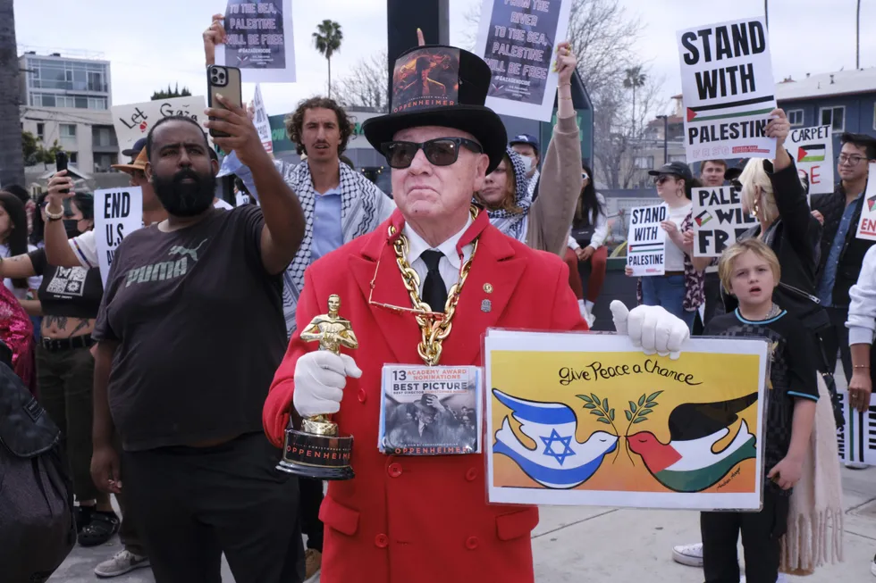 Пропалестинска демонстрация по време на церемонията по награждаването на Оскарите в Холивуд на 10 март 2024 г. Jennifer Lea Osborne / Anadolu / Getty Images