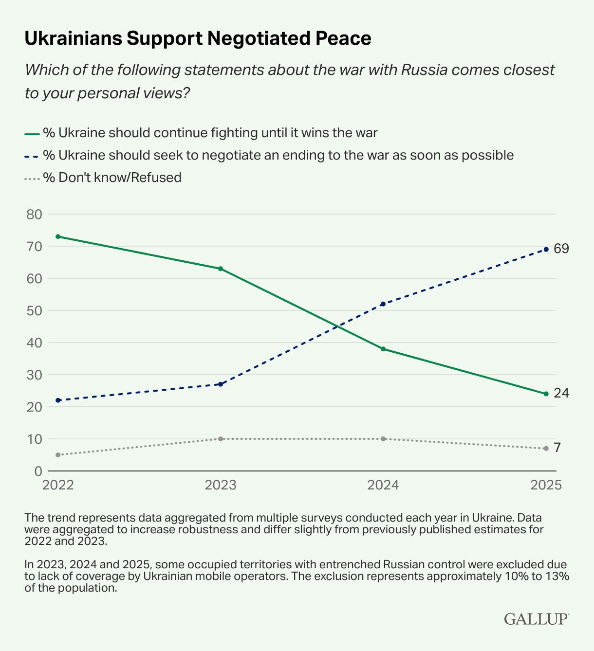 На 7 август американският гигант в социологическите проучвания Gallup публикува забележителните резултати от проучване сред украинците. Обществената подкрепа за Киев, който „се бори до победа“, е спаднала до рекордно ниско ниво „във всички сегменти“ от населението, „независимо от региона или демографската група“. В „почти пълен обрат от общественото мнение през 2022 г.“, 69% от гражданите „залагат на преговори за прекратяване на войната възможно най-скоро“. Само 24% искат да продължат да се борят. Въпреки това, малцина вярват, че войната чрез посредници ще приключи скоро.