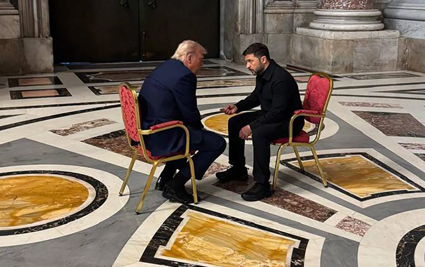 Сбирката между Доналд Тръмп и Володимир Зеленски се оказа една от най-драматичните снимки, излезли от погребението на папа Франциск. Снимка: AFP via Getty