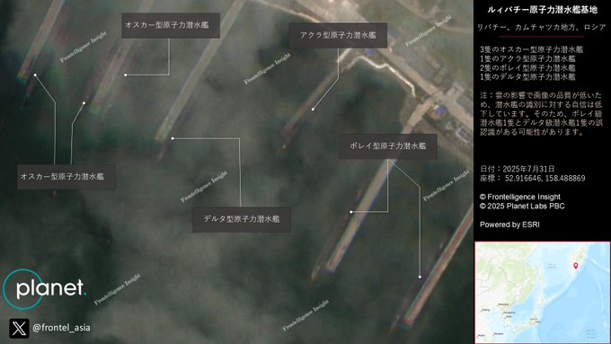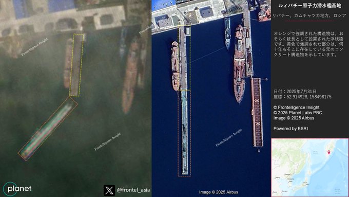 Украинският OSINT проект Frontelligence Insight публикува две сателитни изображения, направени от Planet Labs. Изображенията са разпространени от източноазиатския клон на проекта в социалната мрежа X. Съдейки по координатите в описанието, изображенията от 31 юли показват залива Крашенинников. На изображенията се вижда малко заради облаците. Както отбеляза проектът, едно изображение показва ядрена подводница, която не е получила забележими щети, а инфраструктурата в близост е леко повредена.