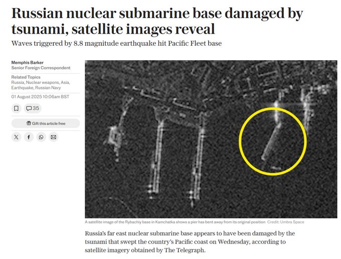 Атомната подводна база „Рибачий“ на руския Тихоокеански флот, разположена в затворения град Вилючинск в Камчатския край, вероятно е била повредена от цунамито, възникнало след земетресението на 30 юли, съобщи The Telegraph на 1 август, позовавайки се на сателитно изображение.