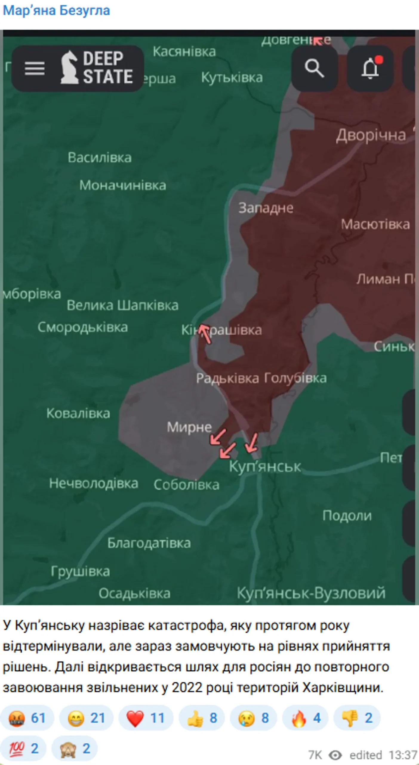 Депутатът Маряна Безуглая заяви, че в Купянск, Харковска област, „се задава катастрофа“. Според нея руснаците биха могли да си върнат териториите, освободени от украинските въоръжени сили през 2022 г.