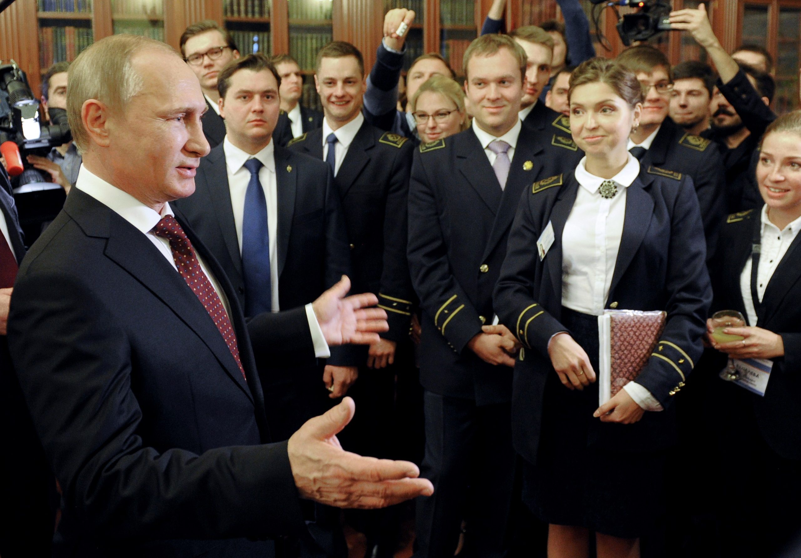 Russian President Vladimir Putin (L) meets with students at the Gornyy National Mineral Resources University in St. Petersburg on January 26, 2015. President Vladimir Putin sharply ramped up his anti-Western rhetoric on January 26, 2015, accusing the Ukrainian army of being "NATO's foreign legion" whose main purpose was to contain Russia. AFP PHOTO / RIA NOVOSTI / MIKHAIL KLIMENTYEV